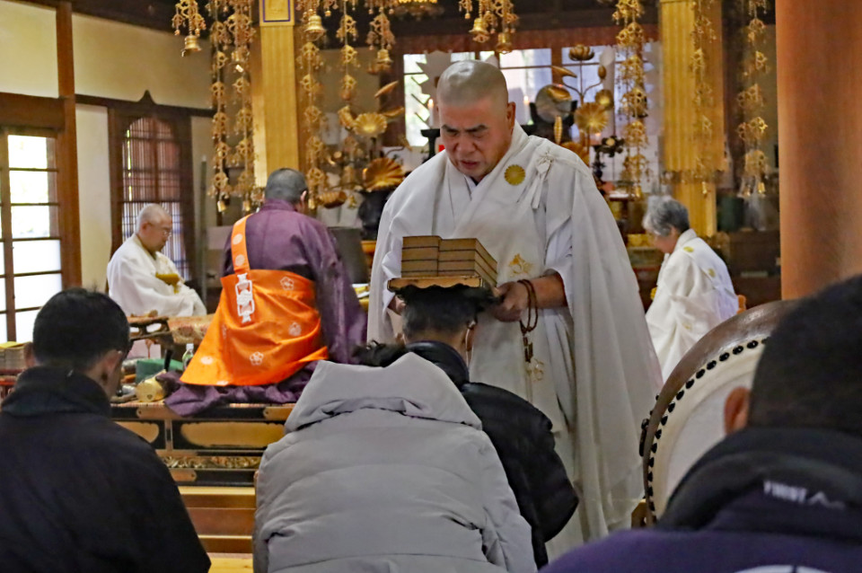 日蓮宗の経本全巻を頭上に頂く参拝者